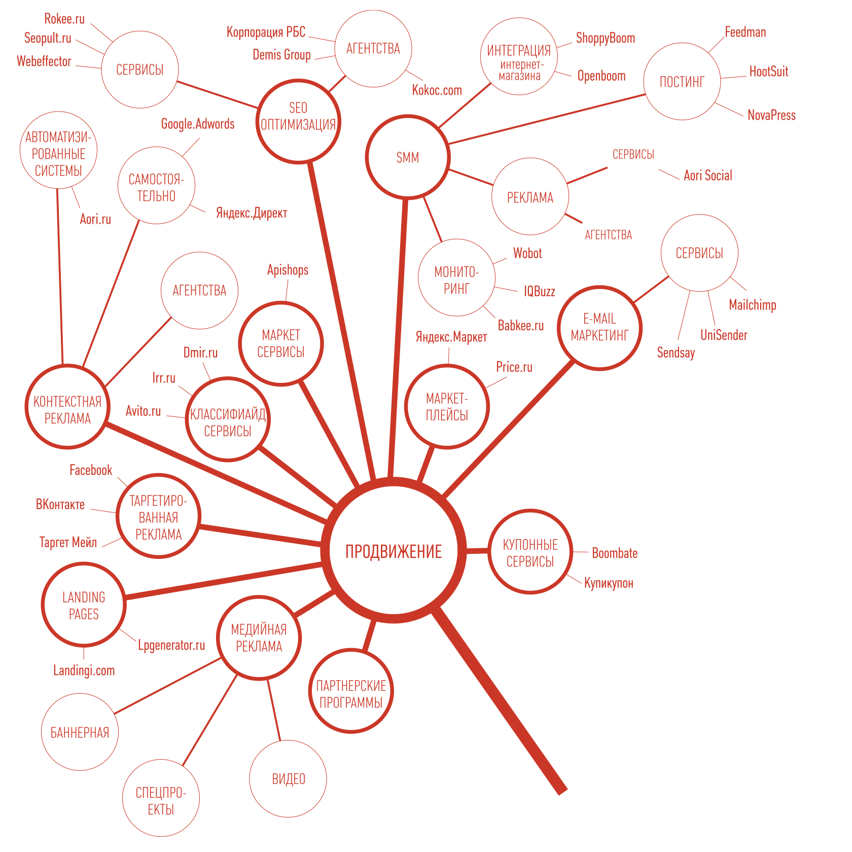 Продвижение. В продвижение входит медийная, таргетированная реклама, маркет-сервисы, маркет-плейсы, e-mail маркетинг и пр.