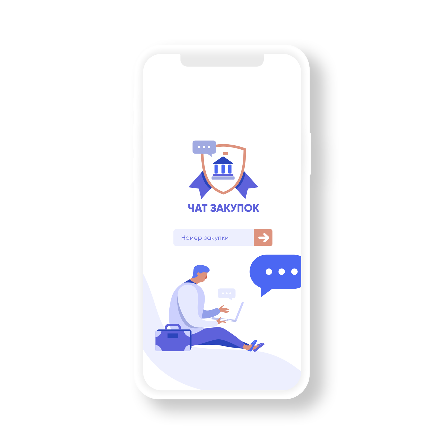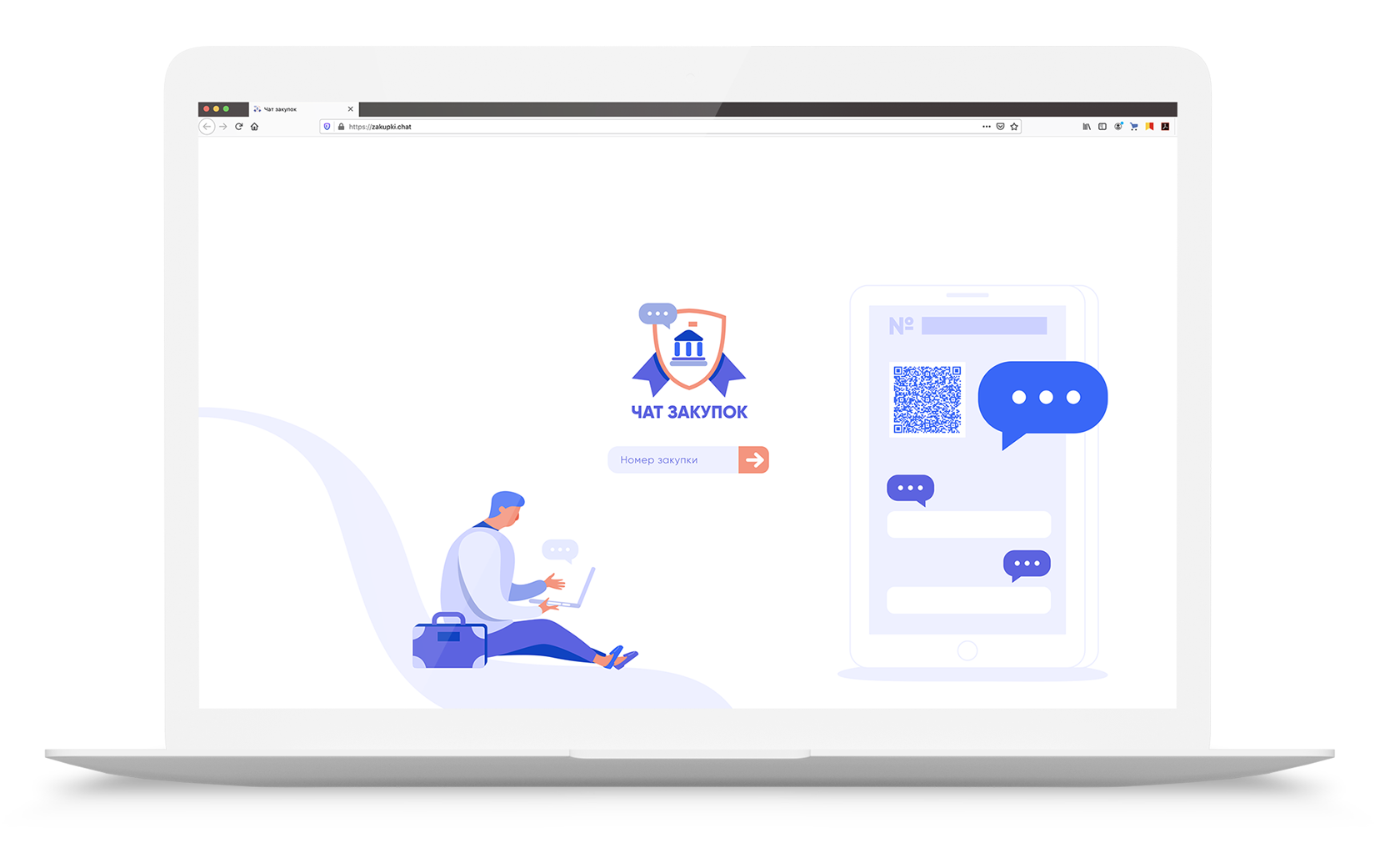 Необходимо было создать дизайн главной страницы, попадая на которую человек видел форму входа. После ввода номера торгов госзакупки посетитель перемещается в отдельный анонимный чат, где может напрямую общаться с участниками торгов.