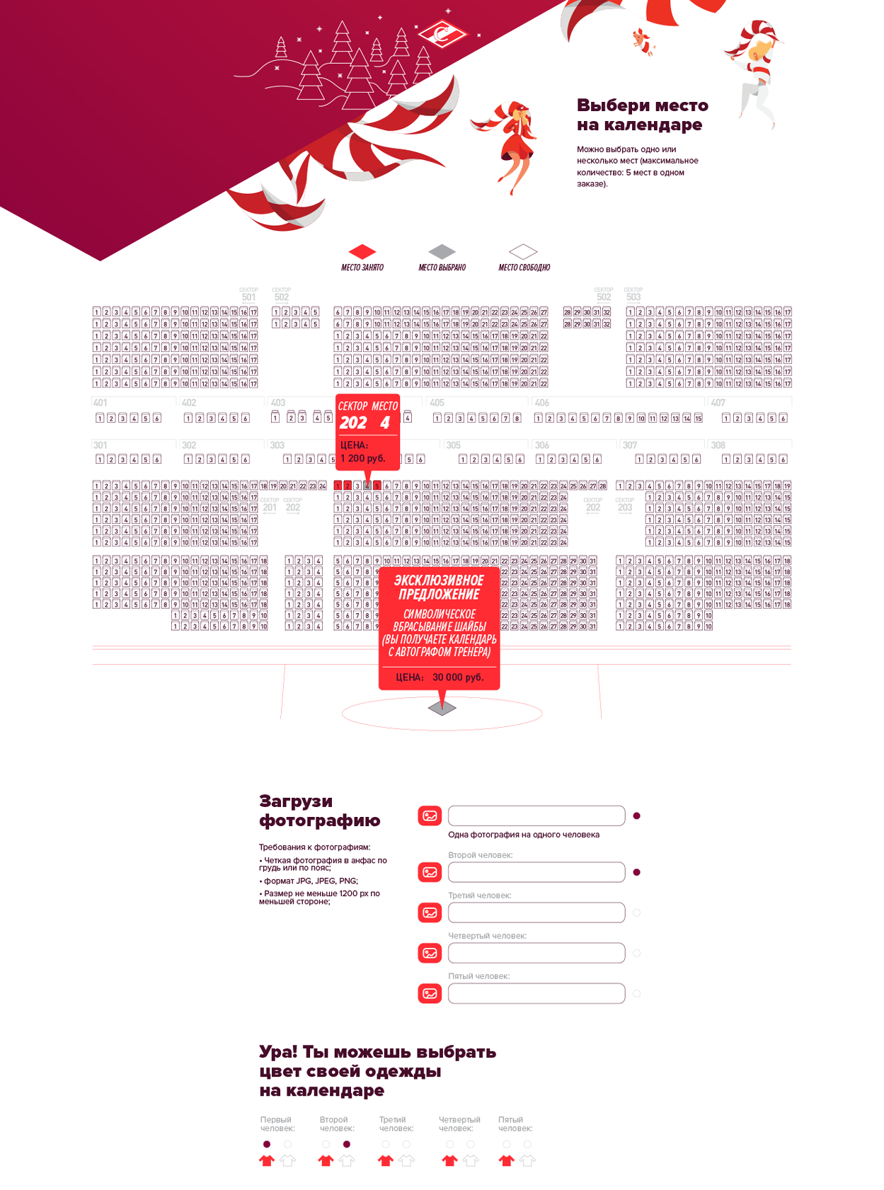 Необходимо было разработать дизайн сайта, на котором было описание проекта, форма заказа и оплата места на календаре. Мы решили выбор места на нарисованном календаре сделать визуально максимально похожим на реальную покупку билета на мероприятие. Тем самым еще больше вовлечь болельщика в нашу игру.