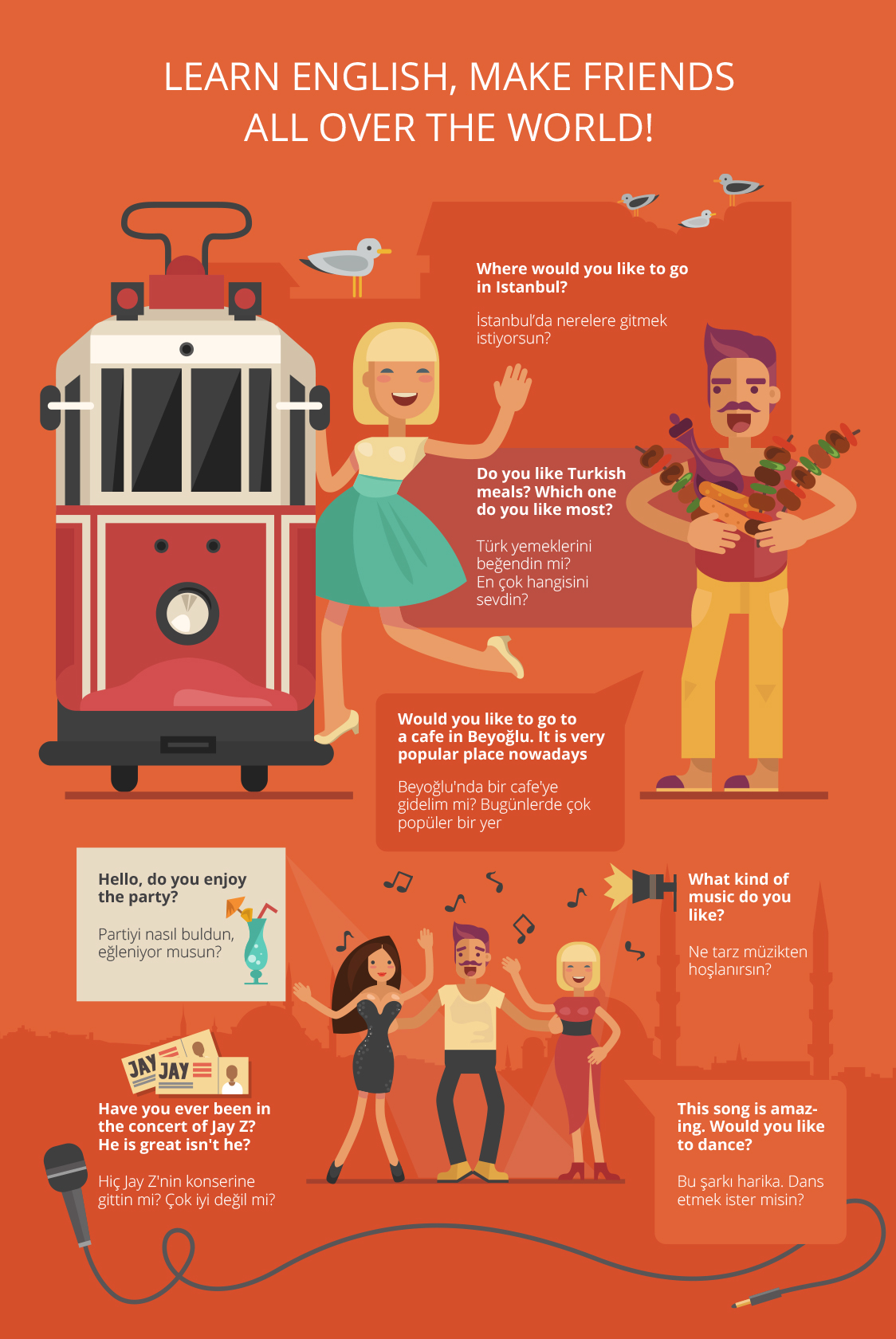 Разработка больших иллюстрированных постеров с необходимыми фразами на турецком для путешествия по Стамбулу.